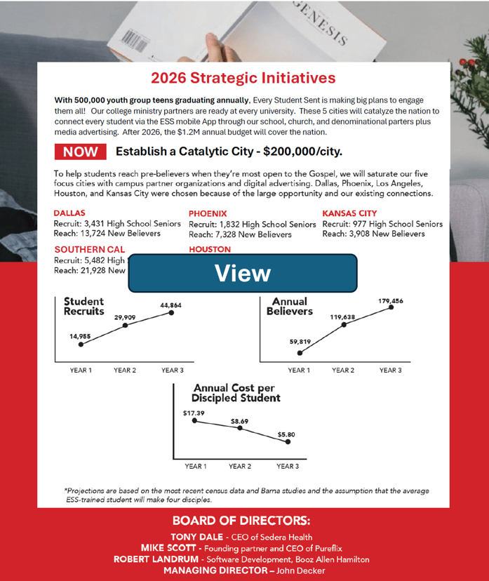 No student should start college alone. It's time for every high school teen to engage now with a team of friends and leaders at their future college, spark awakening in their dorms, then impact culture in their classes and the workplace.