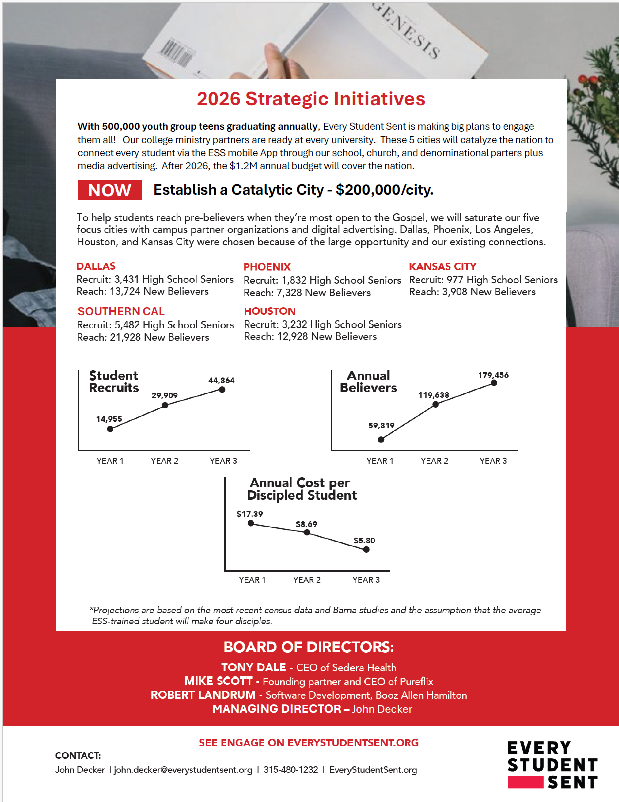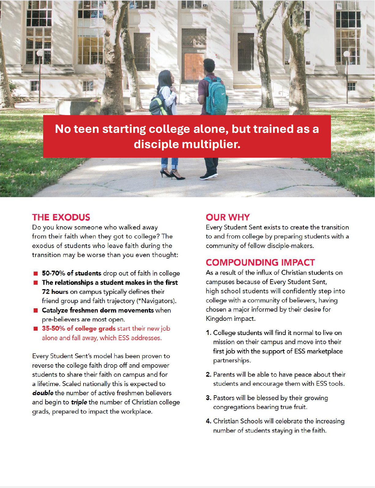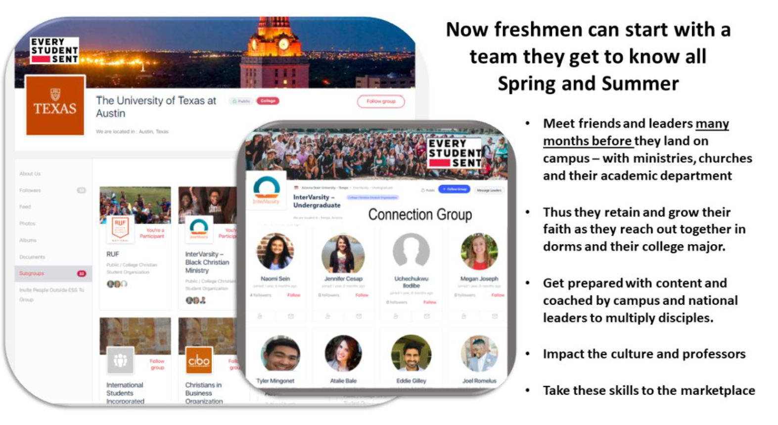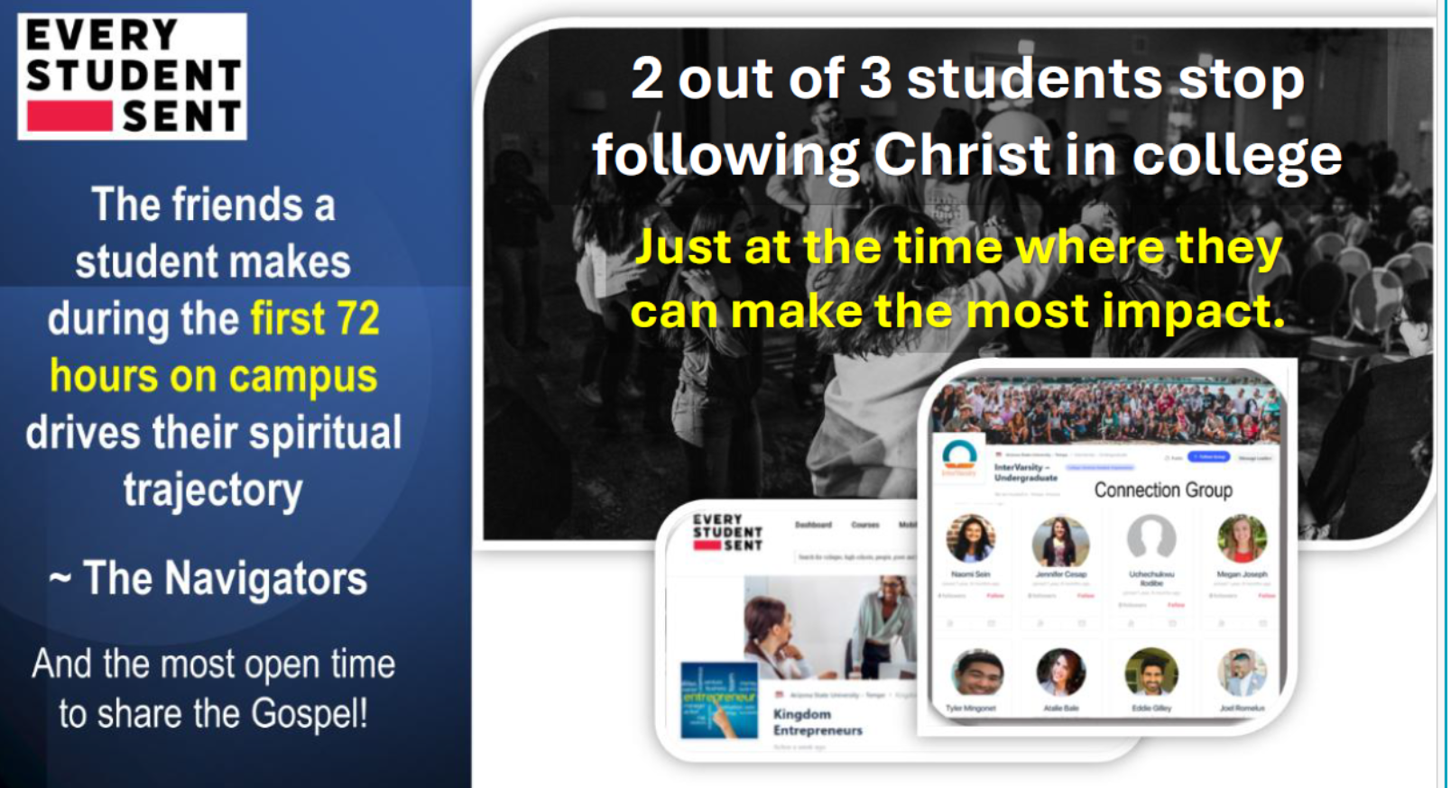 The goal of ESS and the coalition is to reverse the 70% drop-off, and double believers on campuses, in order to triple Christian college grads. We can share how this has worked in individual churches and now being scaled nationally. Every University is now connected. We are marketing first to churches and students in a few cities to spread awareness of the new mobile app nationally.